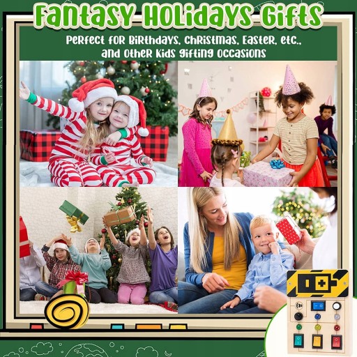 Nasza drewniana zajęta deska została ulepszona o 5 przełączników LED 5 świateł 1 przełącznik dźwiękowy i zabawny projekt pokrywy baterii, który dziecko może trzymać lub położyć na stole, na podłodze dla niekończącej się zabawy!