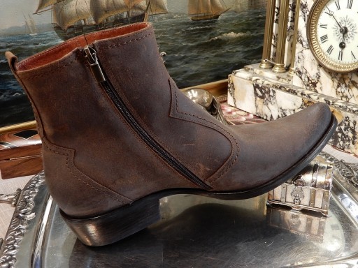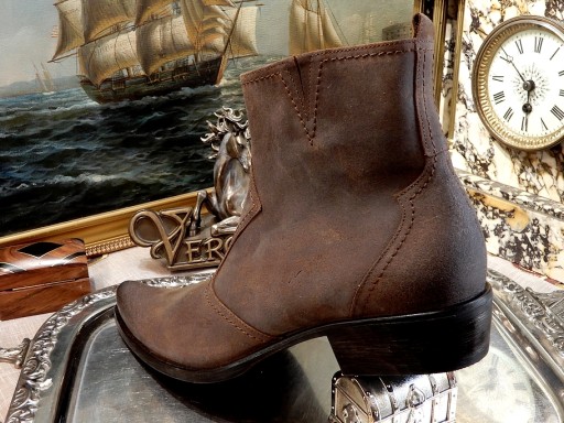 Zapraszamy do kupna pięknych butów, wyjątkowo udanych kolorystycznie, wykonanych ze skóry bydlęcej, typu crazy, wewnątrz również wykończonych skórą naturalną .To nowa skóra, doskonale wpisuje się w "kowbojski klimat ". To taka skóra, że jeśli poskrobiesz paznokciem to zostanie ślad ale po ponownym przetarciu znika .Buty mimo nadają się dla osób z wysokim podbiciem i są wyjątkowo wygodne . Podeszwa elastyczna z doskonałej mieszanki gumowej. Nie ma problemu z konserwacją, najlepiej tłuszczem do butów dwa razy do roku :)Buty w naturze są piękniejsze niż na zdjęciach.