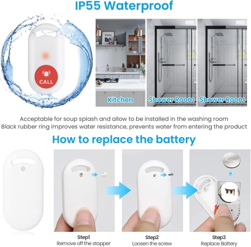 ②Przycisk alarmowy dla seniorów: inteligentny pager Caregiver jest idealny jako alarm dla tych, którzy potrzebują szybkiej pomocy, takich jak osoby starsze, niepełnosprawne, kobiety w ciąży lub chorych. Wystarczy cisnąć przycisk połączenia, aby zapewnić odpowiednią pielęgcję bez krzyku. Idealnie daje się również jako dzwonek do drzwi.
