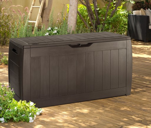 Faktura imitująca drewno będzie spójna z każdą aranżacją wnętrza oraz wkomponuje się w pozostałe elementy architektury ogrodowej. Klasyczna, stonowana kolorystyka nie znudzi Ci się z upływem lat. Schowek wyróżnia się także wygodą użytkowania: dwa szerokie uchwyty pozwolą bez przeszkód przenieść go w inne miejsce. Skrzynia nie wymaga konserwacji i jest bezproblemowa w utrzymaniu czystości. Z łatwością zmontujesz ją bez użycia narzędzi dzięki elementom wyposażonym w zatrzaski.