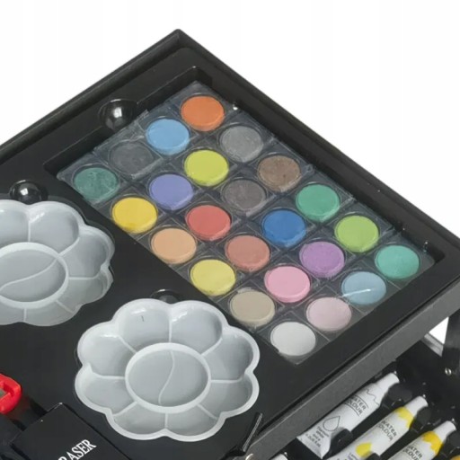 Cały zestaw bez problemu można zabrać ze sobą w plener czy do znajomych dzięki praktycznej walizce. Składa się ona na cztery części, które posiadają wytłaczane przegródki na kredki, flamastry i akcesoria. Każdy element ma swoje miejsce co pozwala zachować porządek przez cały czas użytkowania. Wszystkie elementy są porządkowane i zabezpieczone dzięki solidnej obudowie.