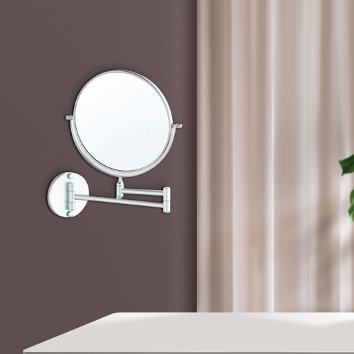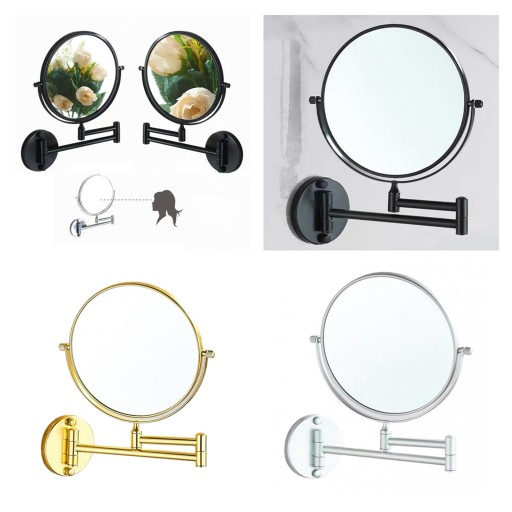 - To montowane na ścianie lustro o eleganckim wyglądzie ma płynną funkcję obrotu, jest składane i regulowane.