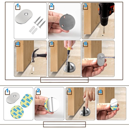 Stoper można zamontować w bardzo łatwy sposób. Magnes możesz przykręcić lub przykleić do podłogi, a regulowany odbojnik możesz przykręcić lub przykleić do drzwi. Dobre rozwiązanie w sytuacji gdy drzwi niszczą nam ścianę lub otwierają się za szeroko.