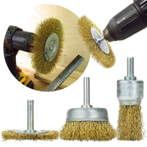 Sprawdzą się podczas prac renowacyjnych, do usuwania grubych powłok lakierniczych, czyszczenia lutów, matowienia powierzchni. W zestawie znajdują się szczotki w 3 kształtach i rozmiarach. Garnkowa, płaska, oraz pędzelkowa. Każda z nich znajdzie zastosowanie podczas obróbki różnych kształtów. Szczotki kompatybilne są z wiertarkami. Wyposażone w gwint walcowy 1/4’’, dzięki któremu mocowanie jest łatwe i szybkie.