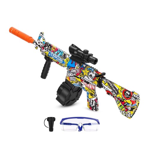 Najfajniejszy na widowni: Kto może odrzucić 80 cm (po złożeniu) duży elektryczny pistolet na zabawki w kształcie M4! Kolorowy wygląd sprawia, że przyciągasz wzrok w tłumie. Oprócz okularów ochronnych wyposażyliśmy Cię w 8 innych akcesoriów. Dzięki ultradługiemu zasięgowi strzelania 15-20 m możesz zabłysnąć w „bitwie”! !
