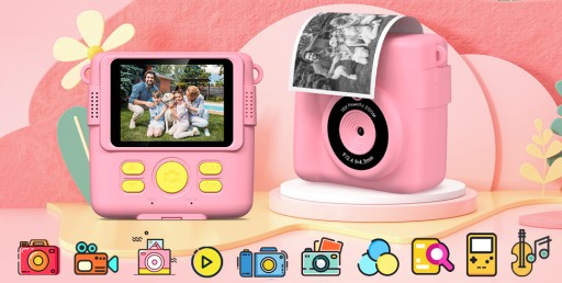- Ten aparat dla dzieci z możliwością natychmiastowego wydruku, dużym ekranem o przekątnej 2,4 cala, wideo 1080P, 16-krotnym zoomem cyfrowym, lampą błyskową, funkcją nagrywania poklatkowego, zdjęciami ciągłymi, grami, ramką filtra i MP3.