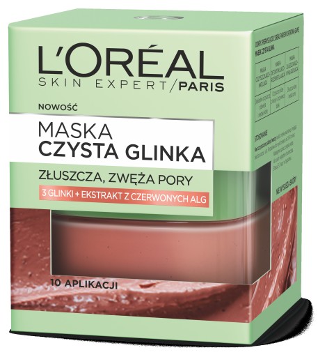 MASKA CZYSTA GLINKA marki L'Oréal, Wygładza i zmiękcza skórę, a także sprawia, że pory i niedoskonałości są mniej widoczne, Dodatkowo, naturalne, czerwone algi rozjaśniają i wyrównują koloryt, Produkt zawiera 3 glinki: absorbującą nadmiar sebum kaolin, redukującą niedoskonałości montmorylonit oraz rozjaśniającą cerę ghassoul, Kosmetyk umieszczono w poręcznym słoiczku, dzięki czemu aplikacja jest niezwykle prosta i przyjemna,