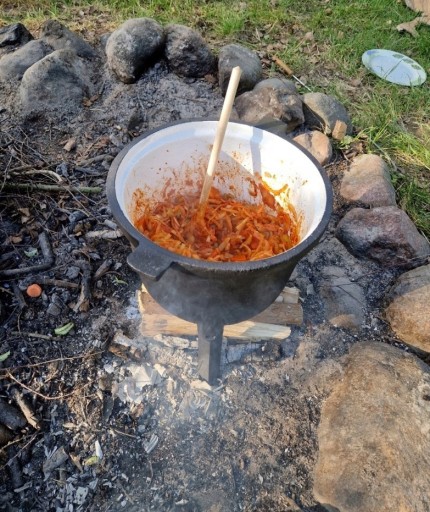 ✅ Kociołek może stać bezpośrednio w ognisku lub być zawieszony nad ogniskiem.
