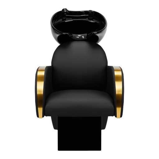 Odpowiednio wyprofilowany fotel wypełniony trwałą pianką zapewnia wysoki komfort użytkowania, a eleganckie podłokietniki pozwalają na prawidłowe ułożenie barków klienta. Oparcie umieszczone pod optymalnym kątem pozwala na zajęcie odpowiedniej pozycji i sprzyja doskonałemu wsparciu kręgosłupa. Pokrycie w odcieniach czerni oraz ozdobne powierzchnie metalowe lakierowane w barwach złota nadają mu wyraz ponadczasowej elegancji, a dodatkowo gwarantują wieloletnią wytrzymałość oraz łatwość czyszczenia. Wyróżniające myjnię klasyczne wykończenie sprawia, że będzie doskonale prezentować się w niemal każdej przestrzeni. W zestawie znajduje się kompletna armatura w odcieniach czerni, w tym bateria, słuchawka prysznicowa oraz dedykowane węże, aby zapewnić całkowity zestaw narzędzi do pracy.