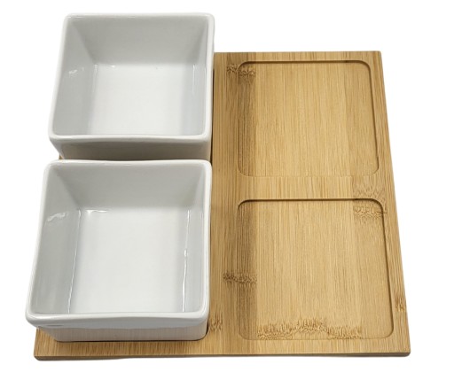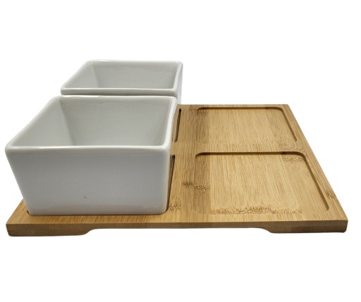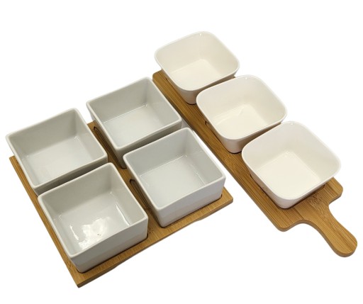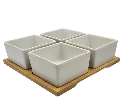 Składa się z czterech porcelanowych miseczek oraz eleganckiej bambusowej deseczki, idealnej do serwowania przekąsek, dipów i sosów.