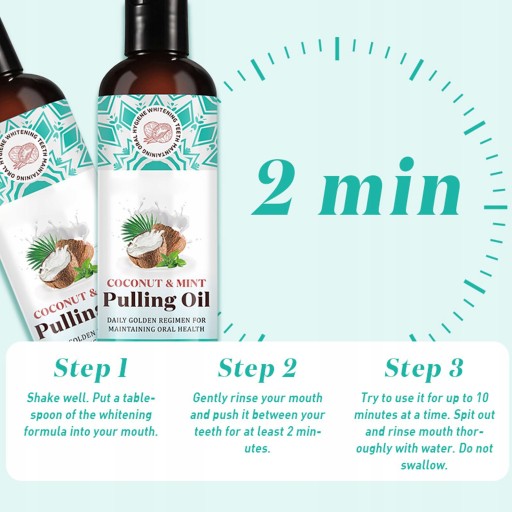 2. Wspomaganie higieny zębów: Odświeżający pyn do pukania jamy ustnej na bazie oleju kokosowego pomaga wyeliminować nieświeży oddech, wspomaga zdrowie dziąse, wzmacnia i wybiela zęby.