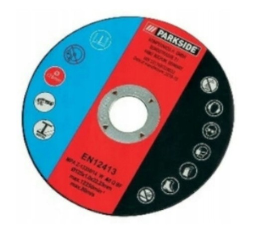 - Akcesoria: 1 tarcza tnąca do metalu Ø 125 mm (wstępnie zamontowana), 1 dwuotworowy klucz montażowy