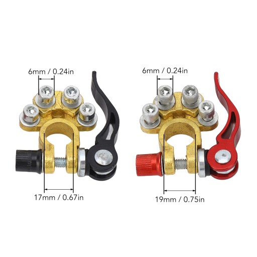 1. ZASTOSOWANIE: Zaciski dodatnie i ujemne akumulatora, czerwony dla bieguna dodatniego i czarny dla bieguna ujemnego, odpowiednie dla akumulatora 45-200AH, dla cylindrycznego akumulatora samochodowego SAE JIS.