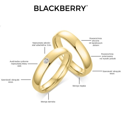 OBRĄCZKI ŚLUBNE ZŁOTE STAL 316L KOMPLET OBRĄCZEK PARA BLACKBERRY KO18