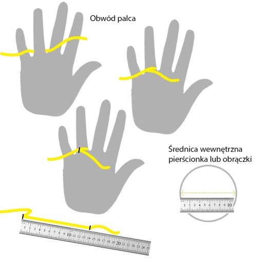 - Polskie rozmiary jubilerskie 25,26,27 / Średnica wewnętrzna ok. 21mm / Obwód palca 65-67mm / Zagraniczny rozmiar 11