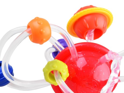 Zabawka składa się z czerwonej, obrotowej planty, od której odchodzą silikonowe, giętkie rurki, na których są umieszczone kolorowe orbity z przeróżnymi wypustkami.