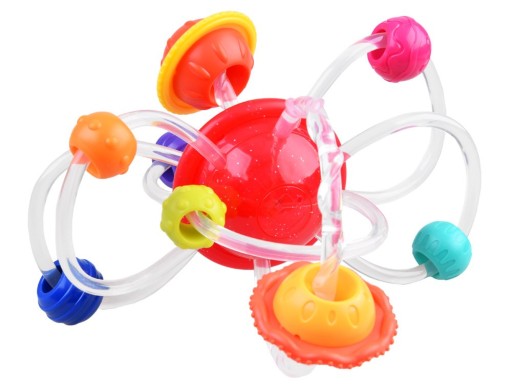 Gryzak ma szczególne zastosowanie wówczas gdy niemowlę potrzebuje masować swoje obolałe dziąsła. Dzięki przeróżnym wypustkom na orbitach oraz silikonowych rurkach, maluszek może koić poprzez gryzienie danych elementów z zabawki swoje rozdrażnione, obolałe dziąsła. Gryzak zachęca do zabawy poprzez kolorowe orbity, obrotową planetę oraz łatwo chwytalne silikonowe rurki. Dzięki giętkim elementom, dziecko bez problemu będzie mogło trzymać w rączkach zabawkę. Kolorowe orbity umieszczone na giętkich zawijasach z łatwością się przesuwają po zabawce.
