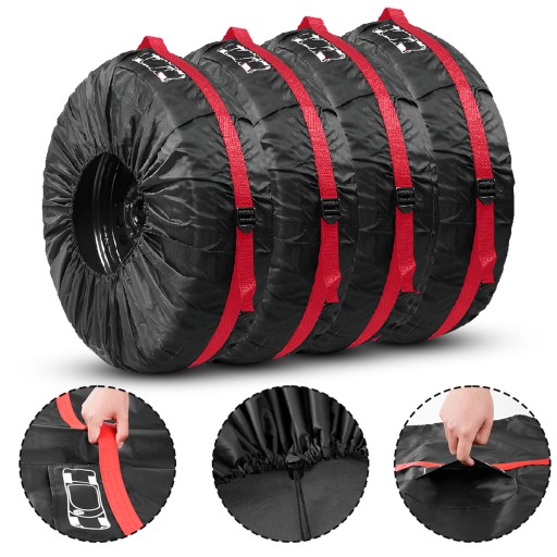 ⭐ W zestawie znajdują się 4 pokrowce na opony w kolorze czerwono-czarnym. Każdy pokrowiec jest wyposażony w praktyczny uchwyt, który ułatwia transport koła.