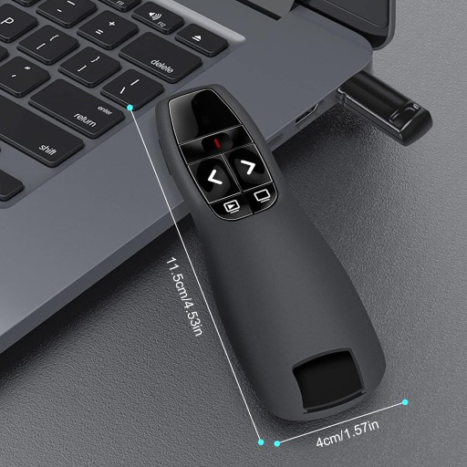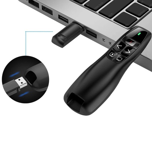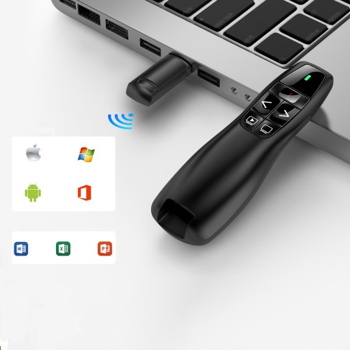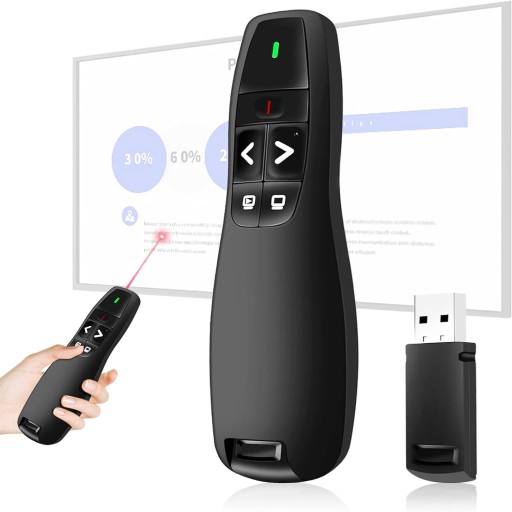 Nowy, dedykowany, markowy pilot do prezentacji (i innych, podobnych programów z pakietu pakietu MS Office i analogicznych na iOS) ze wskaźnikiem laserowym. Drobny, dobrze leży w dłoni, pokryty jest antypoślizgowym materiałem. Wystarczy podłączyć dołączony odbiornik USB (w kształcie pendrive) do komputera lub laptopa i włączyć pilota. Możemy zdalnie przełączać strony, slajdy, wstrzymywać i włączać pokaz slajdów.