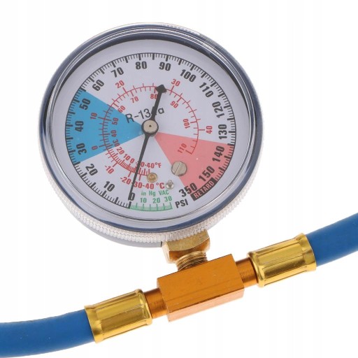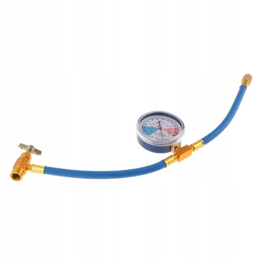This unique can tap has an R-134a screw on can connection and a R12/R22 service port connection. It was made for cans which have a R-134a thread and allows you to install directly to R12 and R22 systems. Centrally installed is an easy to read pressure gauge.