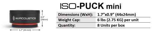 ISO-PUCK mini są sprzedawane w zestawie po 8 sztuk. Jedna sztuka izolatora jest przewidziana na obciążenie do 2,75 kg. W zależności od wagi głośnika, korzysta się z 3 lub więcej izolatorów.