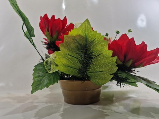 Stroik w komplecie wykonany z kwiatów sztucznych na donicy zalanej betonem.