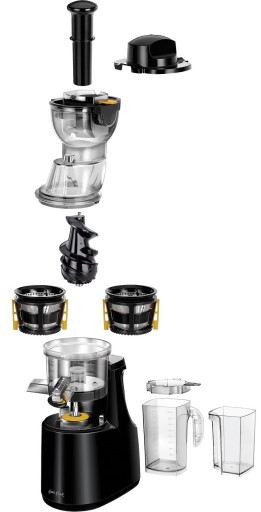 - Funkcje: Funkcja reverse, Regulacja gęstości soku, Możliwość mycia elementów w zmywarce, Wyjmowany zbiornik na miąższ