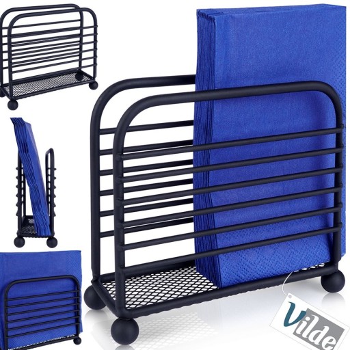 Serwetnik wykonany z solidnych materiałów. Odpowiedni do wygodnego przechowywania serwetek na stole. Dzięki niemu serwetki będą zawsze na swoim miejscu. Stojak na serwetki prezentuje się bardzo elegancko, w całości utrzymany w modnym, czarnym kolorze. Przydatny zarówno do użytku domowego, jak i w gastronomii. Oryginalny produkt marki Vilde. Wyprodukowano zgodnie z europejskimi standardami.
