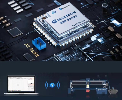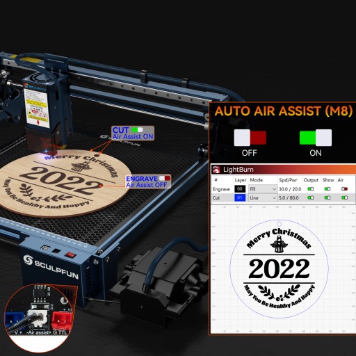 Automatycznie sterowany system wspomagania powietrzam: Tradycyjny adapter wspomagania powietrza będzie zawsze wyłączony i nie będzie można go kontrolować podczas grawerowania, a wygrawerowany wzór zostanie zamieniony w rozmytą mgłę. Seria S30 jest wyposażona w płytę główną airassist 32-bit i pompę powietrza typu mechanizmugo, która może inteligentnie sterować sterowaniem wspomagania powietrzam podczas grawerowania za pomocą przycisku M8 oprogramowania LightBurn, dzięki czemu grawerowanie i cięcie są bardzo czyste i dokładnie obsługiwane przez wytwarzanie wykwintnych prezentów.