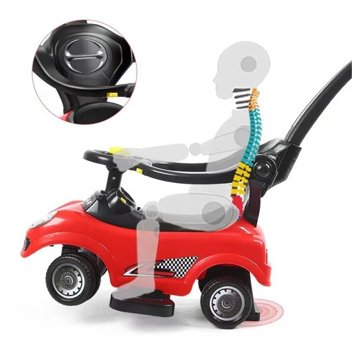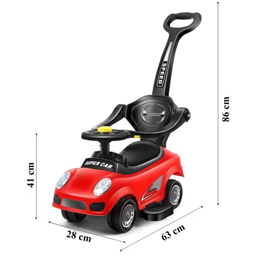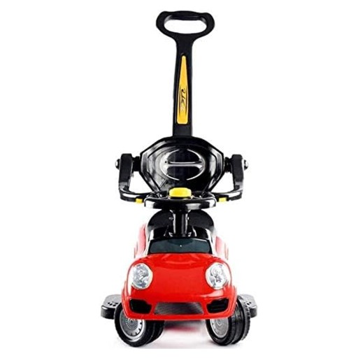 Jeździk w kolorze CZERWONYM z rączką przeznaczony dla maluchów powyżej pierwszego roku życia.