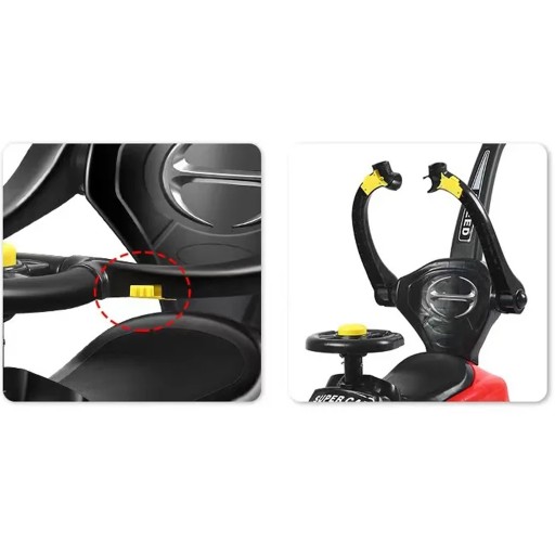 Jeździk posiada duże skrętne koła, które w połączeniu z imitacją alufelg zrobią ogromne wrażenie na każdym dziecku.