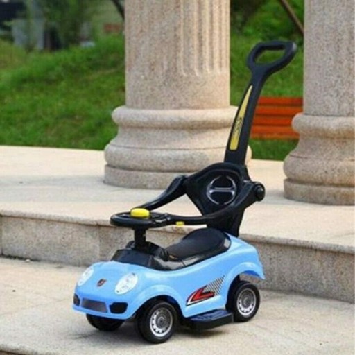 Jeździk w kolorze NIEBIESKIM z rączką przeznaczony dla maluchów powyżej pierwszego roku życia.