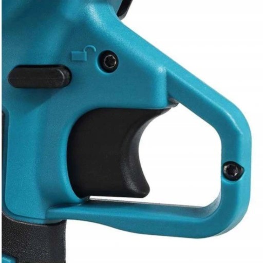 - Blokada zabezpieczająca przed przypadkowym uruchomieniem (aby uruchomić pilarkę należy jednocześnie nacisnąć blokadę i przycisk)