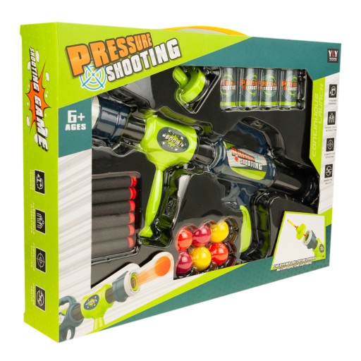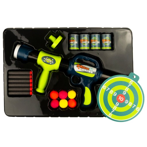☑️ W zestawie: pistolet, 6 miękkich naboi, 6 kulek, 4 puszki, tarcza.