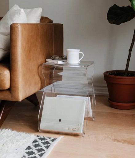Stolik wykonany jest z przezroczystego akrylu o grubości 1,3 cm. Można obciążyć go max. 90 kg.