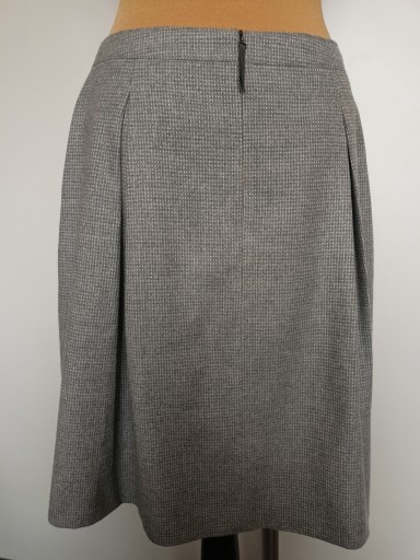 Lekko grubsza, z miękkiego materiału na jesień-wiosna, spódnica, w rozmiarze 38. Gora w pasek, pod nim zakladki. Po bokach skośne kieszenie. Zapinana na tyle suwakiem. Na podszewce. 69%poliester, 29% wiskoza, 2% elastan