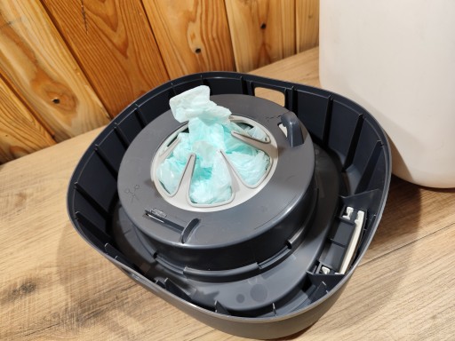- Ochrona przed przykrymi zapachami: to jedyny kosz na zużyte pieluchy, w którym jeden ruch zawija każdą pieluchę w folię, dzięki czemu nieprzyjemne zapachy nie wydostają się na zewnątrz, nawet przy otwartym wieku