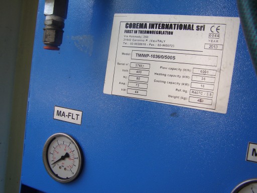 Dzień dobry,proponuję Chiller Corema TM/WP-1036/0/500S .Prudukcja Italy , 2013 r. zdemontowany w 2019r ,do dzisiaj nieużywany.Stan idealny. Moc chłodnicza 16kw ,moc grzewcza 36kw.Gaz R407c. , odbiór osobisty