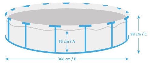 Podane rozmiary basenu są jedynie orientacyjne. Może na nie wpłynąć m.in. ułożenie podkładu basenowego lub ilość napuszczonej wody. Różnice w rozmiarach mogą wahać się w zakresie 5%.