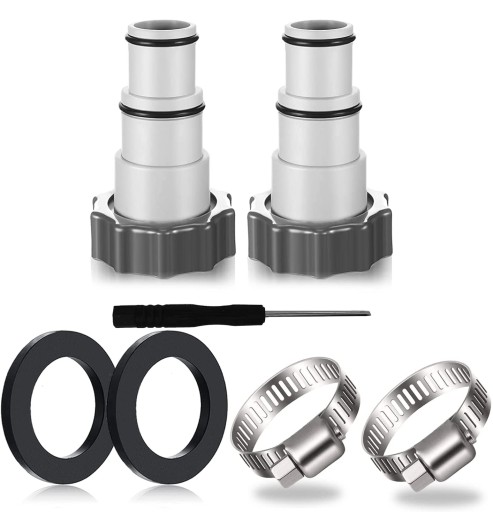 💦【Zestawy adapterów do węża basenowego】 2-pakowy adapter do basenu A, ilość wystarczająca do użycia lub wymiany w życiu codziennym. 2 sztuki opasek zaciskowych i 2 sztuki podkładek żelowych oraz 1 mały śrubokręt dla bardziej wodoodpornego połączenia.