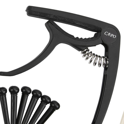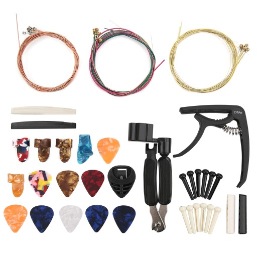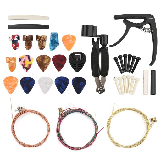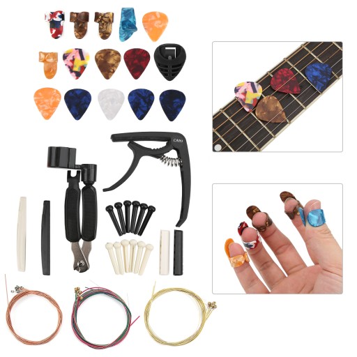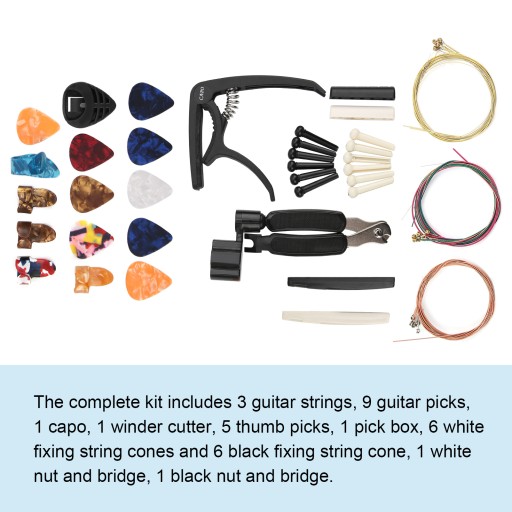 Funkcja:1. Kompletny zestaw zawiera 3 struny do gitary, 9 kostek do gitary, 1 capo, 1 nóż do nawijania, 5 kostek do kciuków, 1 pudełko na pick, 6 białych stożków mocujących i 6 czarnych stożków mocujących, 1 zestaw białej nakrętki i mostka, 1 zestaw czarnego orzecha i mostka.