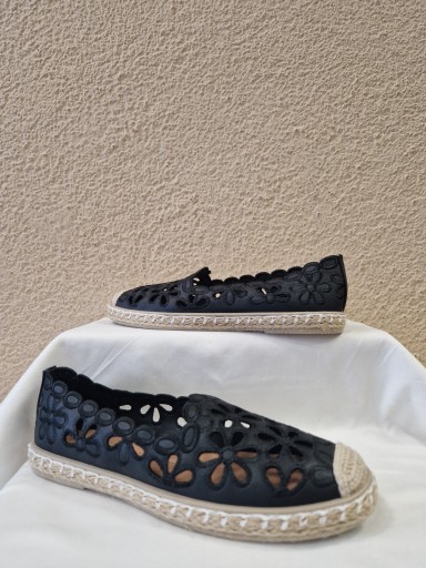 ESPADRYLE COLLECTION PARIS podeszwa wykończona jest lnianym sznurkiem nadaje piękny letni charakter. Buty są lekkie oraz przewiewne, co daje wiele zalet np. fakt iż stopa się nie poci podczas użytkowania. Buty są bardzo wygodne, stopa się w nich nie męczy i można w nich chodzić cały dzień bez uczucia zmęczenia. Materiał zewnętrzny to miękka ekoskóra ażurowa, a wewnętrzna wkładka to bardzo dobra tkanina puchowa.