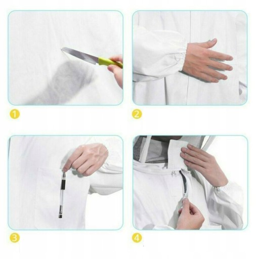 - Wentylowana odzież pszczelarska z mieszanki bawełny zapewnia pełną ochronę od stóp do głów, wyposażona w odpinany welon i rękawiczki z koziej skóry.