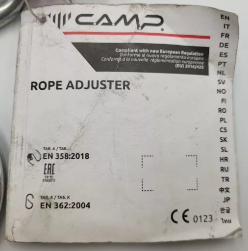 Rope adjuster wykonany jest z 12,5 mm liny statycznej, po której przesuwa się przyrząd zaciskowy pozwalający na regulację długości lonży do 2 metrów. W zestawie jeden duży stalowy zatrzaśnik oraz stalowy karabinek. Przesuwna taśma chroni linę przed przetarciem.