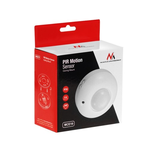Czujnik ruchu pir sufitowy Maclean Energy MCE19 1200W zasięg 6mSufitowy czujnik ruchu 360° - urządzenie mające na celu automatyzację procesów elektrycznych, przy jednoczesnej oszczędności energii elektrycznej. Czujnik znajduje zastosowanie przy automatyzacji procesu załączania i wyłączania prądu, np. włączanie oświetlenia, włączanie systemów alarmowych. Łatwie mocowanie na suficie za pomocą 2 kołków rozporowych. (w komplecie). Czujnik posiada 2 pokrętła umożliwiające dostosowanie parametrów oracy do własnych upodobań: pokrętło LUX umożliwia regulację wartości progowej natężenia oświetlenia (dzięki tej właściwości możemy przystosować go do działania tylko w okresie od zmierzchu do świtu), oraz pokrętło TIME, dzięki któremu możliwa jest regulacja czasu podtrzymania załączenia.