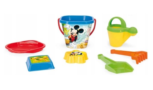 Zestaw do zabawy w piasku dla dzieci składający się z 7 elementów w klasycznych kolorach i grafiką z bajki Myszka Miki spodoba się wszystkim miłośnikom twórczej zabawy w piaskownicy lub na plaży.