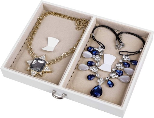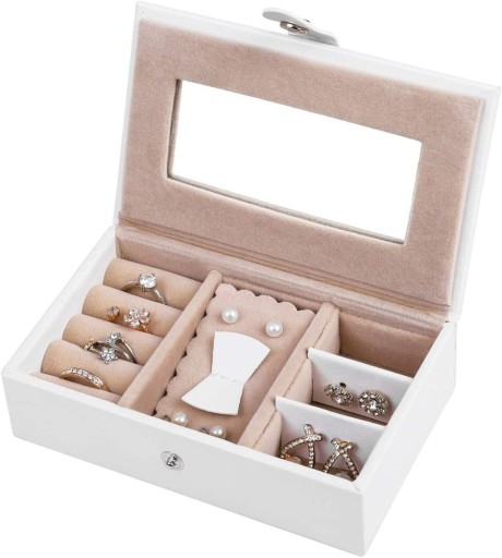 - Co jest w tym pudełku? W tym dużym pudełku na biżuterię o wymiarach 26 x 17 x 18 cm znajdują się 2 szuflady, 2 boczne przegródki na naszyjniki i wiele przegródek na pierścionki i inne akcesoria. W ten sposób oszczędzasz nie tylko miejsce, ale także czas na irytujące poszukiwanie biżuterii.