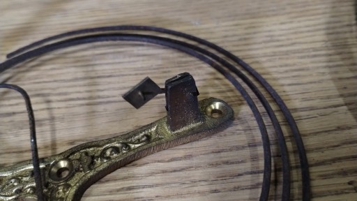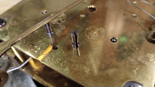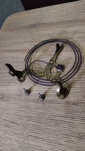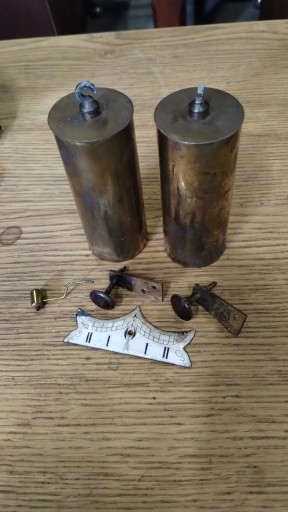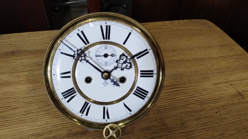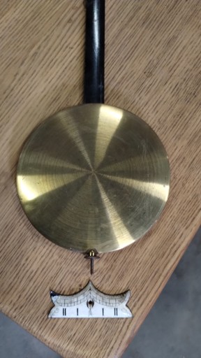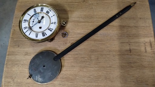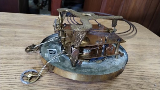 Mechanizm kompletny, w skład zestawu wchodzą sanki z gongiem, mechanizm, wahadło, wagi, śrubki dystansowe, blaszka emaliowana do regulacji, nie wiem czy jest sprawny nie mam kluczyka, żyłki całe, uszkodzony haczyk jednej z wag, oderwany młotek od bicia, zerwana sprężynka od zawiesia wahadła, sprzedaje jako nie sprawny do renowacji. Średnica 18,5 długość z wahadłem 68 wysokość 9,5cm.