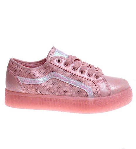 - Wiosenne damskie trampki creeprsy wykonane z ekologicznej skórki w kolorze różowym.
