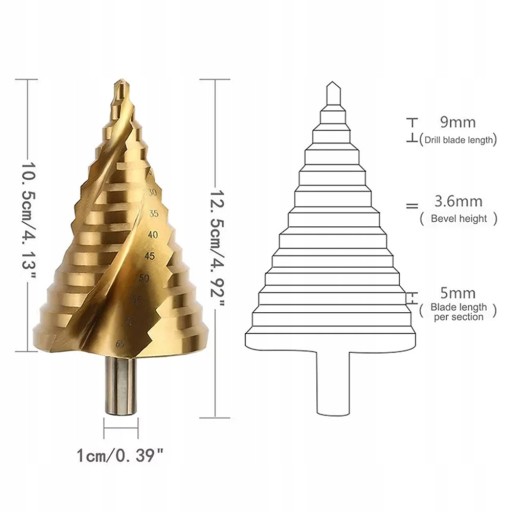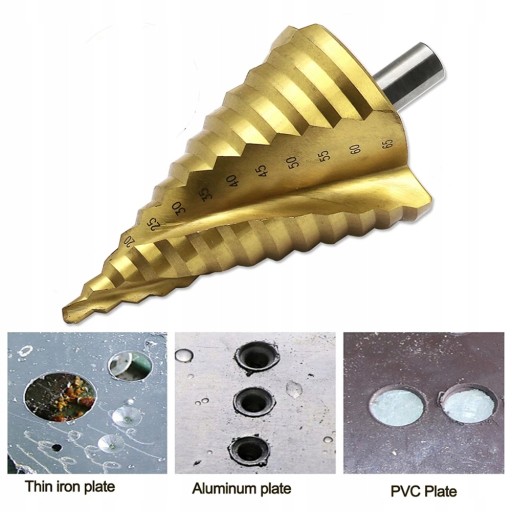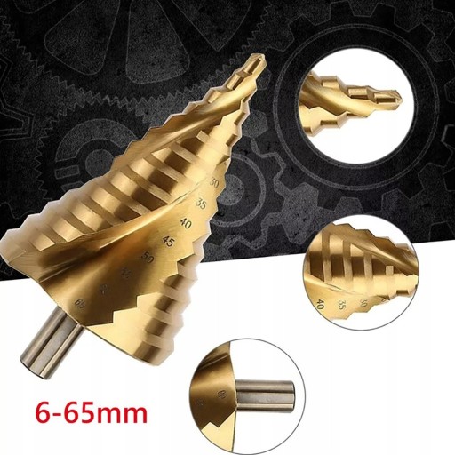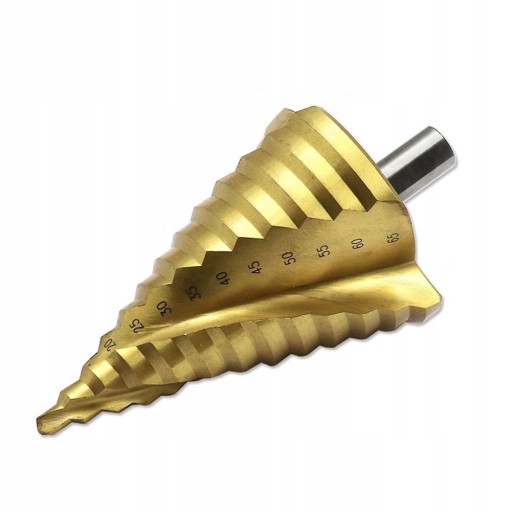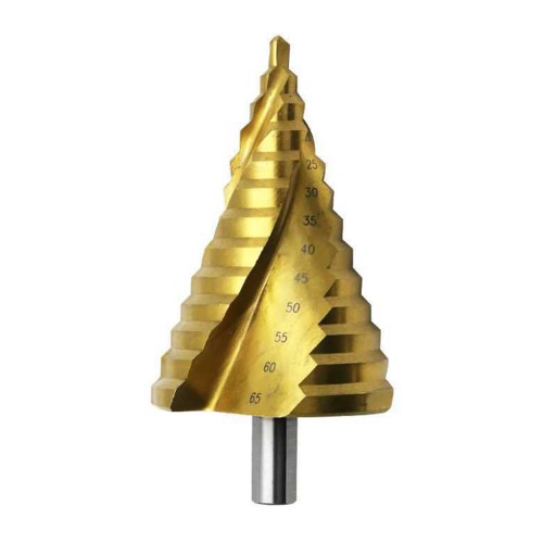 Wiertło stopniowe HSS o średnicy 65 mm z powłoką tytanową, z rowkiem